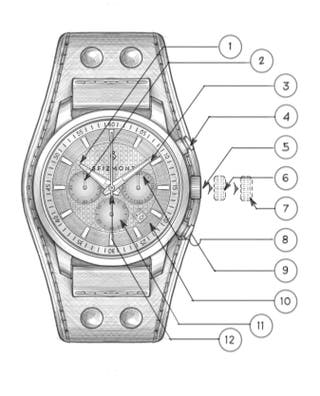 Επαναφορά χρονογράφου (συμπ. και μετά από αντικατάσταση μπαταρίας): Αυτή η διαδικασία πρέπει να εκτελείται όταν ο δείκτης δευτερολέπτων του χρονογράφου δεν επιστρέφει στο 0 όταν γίνεται επαναφορά του χρονογράφου, συμπεριλαμβανομένης της αντικατάστασης της μπαταρίας. Τράβηξε την κορώνα προς τα έξω στη θέση 7. Πάτησε το κουμπί D για να θέσει τον δείκτη δευτερολέπτων του χρονογράφου στο 0. Ο δείκτης του χρονογράφου μπορεί να προχωρήσει γρήγορα πατώντας συνεχώς το κουμπί D. Μόλις μηδενιστεί ο δείκτης, επανέφερε την κορώνα στην κανονική της θέση. Μην πιέζεις την κορώνα στην κανονική θέση καθώς ο δείκτης δευτερολέπτων του χρονογράφου επιστρέφει στη θέση μηδέν. Σταματάει όταν η κορώνα επιστρέψει στην κανονική θέση και η θέση του αναγνωρίζεται ως 0.