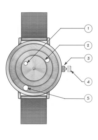 Ρύθμιση ώρας: Τράβηξε την κορώνα προς τα έξω στη θέση 4. Περίστρεψε την κορώνα για να μετακινήσεις τις κουκίδες ώρας και λεπτών. Η κουκίδα δευτερολέπτων θα ξεκινήσει και πάλι όταν γίνει επαναφορά της κορώνας στην κανονική θέση της.