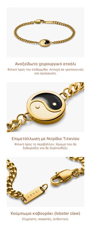 Φορεμένο μόνο του ή μαζί με άλλα βραχιόλια, η λεπτή αλυσίδα και ο στρογγυλός δίσκος yin και yang προσφέρουν μια ισορροπημένη, διακριτική εμφάνιση που ταιριάζει εύκολα με casual πουκάμισα ή με ένα απλό ρολόι. Η γυαλιστερή χρυσή επιφάνεια και η μαύρη λεπτομέρεια δίνουν καθαρή, σύγχρονη όψη χωρίς υπερβολές.